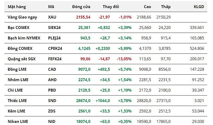 Sắc xanh chiếm ưu thế trên bảng giá kim loại, giá quặng sắt lao dốc