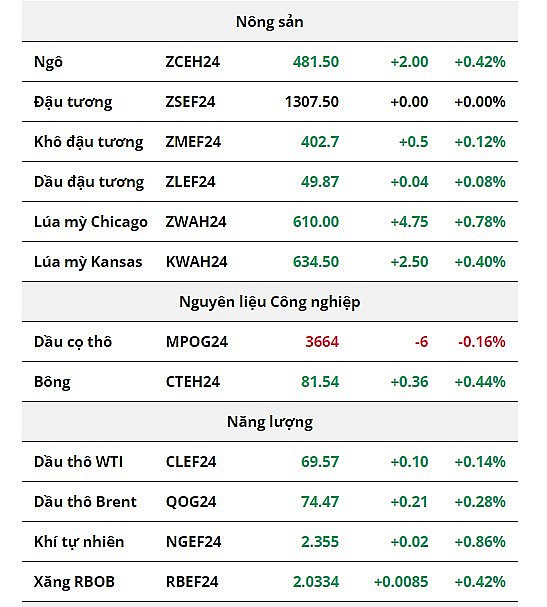 Giá ngô (ZCEH24 +0,42%) và lúa mì (ZWAH24 +0,78%) tạo gap up sau khi mở của phiên sáng nay trong bối cảnh Argentina điều chỉnh chính sách thúc đẩy xuất khẩu của mình. Cụ thể, với nghị định mới, các nhà xuất khẩu ngũ cốc chỉ được giữ lại 20% doanh thu ngoại tệ của mình thay vì 50% như trước đó. Ngoài ra, theo tờ báo địa phương La Nacion cho biết, chính phủ mới có thể yêu cầu tăng thuế xuất khẩu ngô và lúa mì lên mức 15%, từ mức 12% hiện tại. Điều này có thể làm giảm động lực xuất khẩu ngũ cốc của nông dân Argentina, và hỗ trợ giá CBOT.
