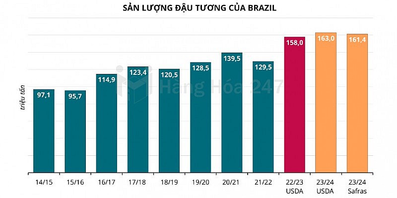 Theo một cuộc khảo sát của Safras & Mercado, sản lượng đậu tương niên vụ 2023/24 của Brazil ước tính sẽ đạt mức 161,38 triệu tấn, giảm 1,15% so với dự báo trước đó được công bố vào tháng 7.