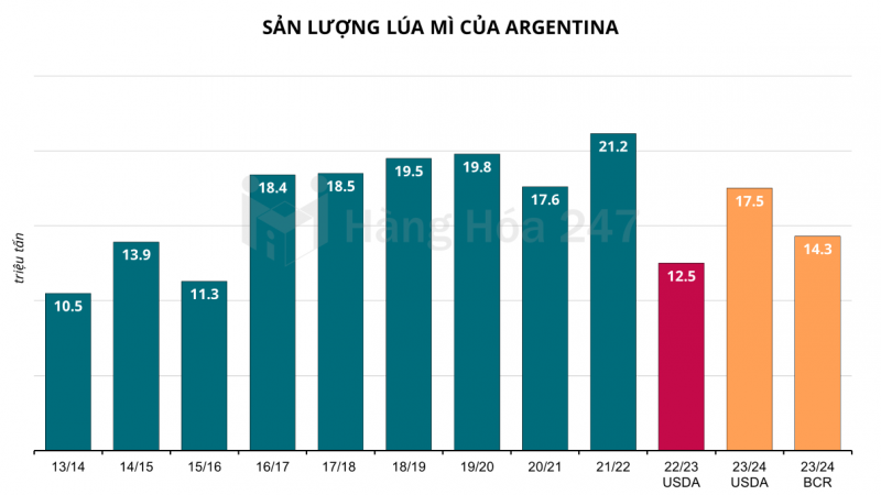 Cụ thể, BCR đã cắt giảm sản lượng lúa mì niên vụ 23/24 của Argentina xuống còn 14,3 triệu tấn, từ mức ước tính 15 triệu tấn trước đó, do một số khu vực sản xuất thiếu mưa.