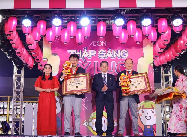 Đại diện VIETKINGS trao 2 chứng nhận kỷ lục Việt Nam cho đại diện AEON Việt Nam |