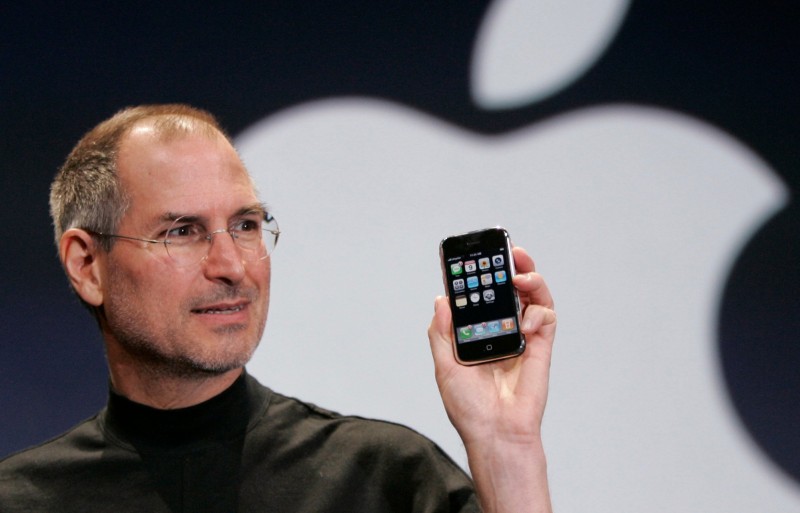 | Cố CEO Steve Jobs của Apple cầm một chiếc iPhone của Apple tại Hội nghị MacWorld năm 2007, ở San Francisco. Ảnh: AP |