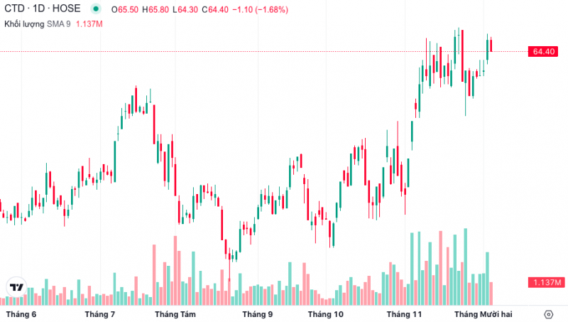 Trên thị trường chứng khoán, đóng cửa phiên giao dịch 5/12, cổ phiếu CTD giảm 1,53% xuống 64.500 đồng/cp, với thanh khoản đạt hơn 1 triệu đơn vị. Mức giá này cao hơn khoảng 35% so với thời điểm đầu tháng 10 vừa qua.