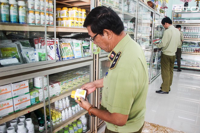 Lực lượng quản lý thị trường tỉnh Sóc Trăng kiểm tra thuốc bảo vệ thực vật tại một cơ sở |