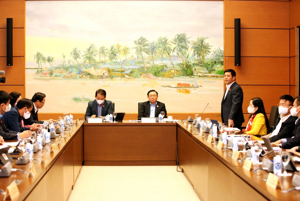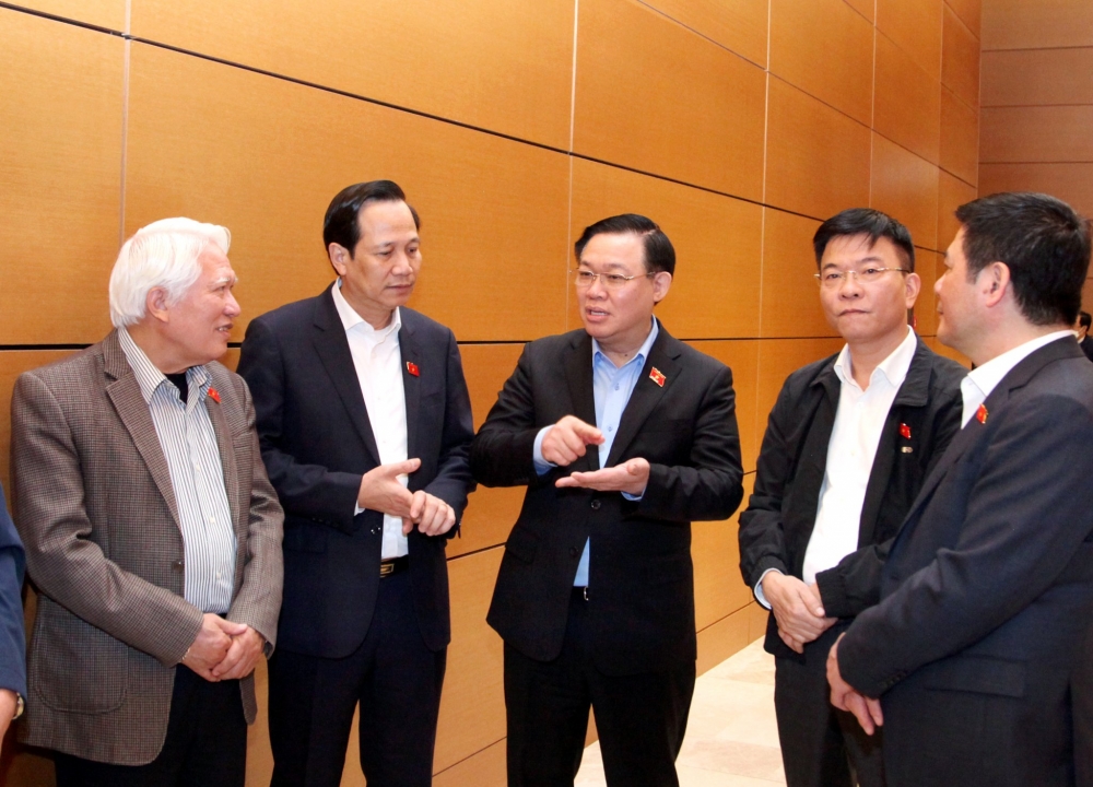 | Chủ tịch Quốc hội Vương Đình Huệ và các đại biểu Quốc hội trao đổi bên lề phiên họp tổ |