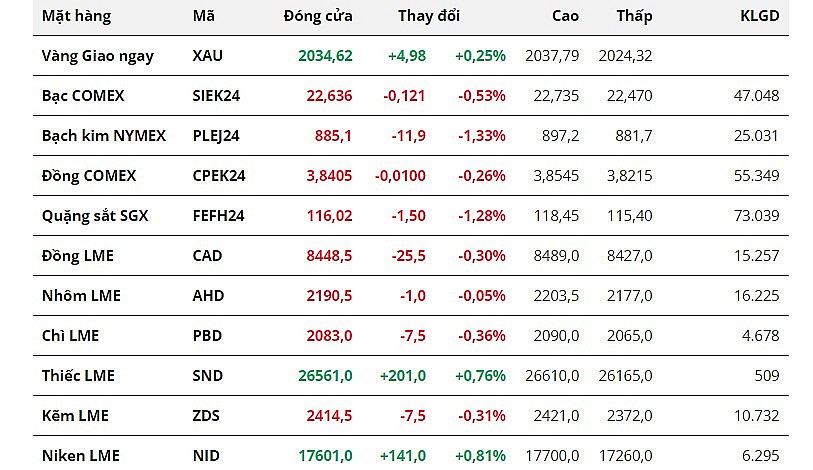 Đối với kim loại cơ bản, giá đồng COMEX quay đầu giảm 0,26%, chốt phiên tại 3,84 USD/pound. Cùng chung xu hướng giảm, giá quặng sắt để mất 1,28% về 116,02 USD/tấn. Đồng USD tăng giá cũng gây áp lực lên giá kim loại cơ bản.