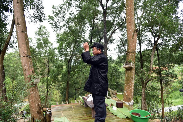 Khi mọi đồ vật đã chuẩn bị xong, mâm cỗ cúng trời là một con gà trống gáy to, đẹp, lông đỏ, xôi màu. Hương được cắm trên thân cây chuối, thầy cúng sẽ tiến hành nghi thức cúng. Và điều đặc biệt là nghi lễ cúng ngoài trời sẽ được diễn ra trong yên lặng và lúc kết thúc cũng là lúc mặt trời lên. Tưởng nhớ những tháng ngày xưa cũ cha ông chạy giặc bí mật trong đêm tối.