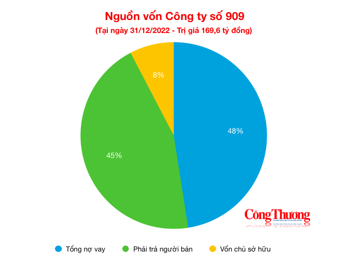 Thêm vào đó, khá bất ngờ khi Công ty số 909 của ông Phạm Ân Trường chỉ có vốn điều lệ 9 tỷ đồng. Nhà thầu phải dựa vào các chủ nợ, vì vậy riêng khoản tiền vay đã lên tới 70 tỷ đồng, gấp hơn 6 lần vốn chủ sở hữu, tính đến thời điểm cuối năm 2022.