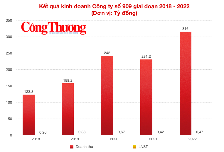 Vì vậy, doanh thu của Công ty số 909 giai đoạn 2018 - 2022 liên tục tăng trưởng, lần lượt đạt 123,8 tỷ đồng, 158,2 tỷ đồng, 242 tỷ đồng, 231 tỷ đồng và 316 tỷ đồng.