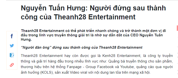 Theo hồ sơ, Công ty cổ phần Kênh 28 Entertainment thành lập ngày 11/5/2018, người đại diện pháp luật kiêm Giám đốc là ông Nguyễn Văn Hưng. Ở thời điểm thành lập, công ty có vốn điều lệ chỉ 1 tỷ đồng. Cơ cấu cổ đông gồm ông Nguyễn Văn Hưng (sở hữu 40% vốn công ty), ông Nguyễn Hoàng Long (sở hữu 30% vốn công ty) và ông Nguyễn Thế Anh (sở hữu 30% vốn công ty).
