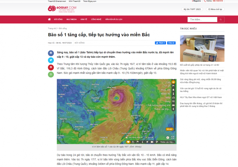 Tương tự, lúc 9 giờ 42 phút ngày 16/7/2023, trên mục Đời sống trang 60giay.com có bài “Bão số 1 tăng cấp, tiếp tục hướng vào miền Bắc”. Ở cuối bài viết thể hiện nguồn được lấy từ Tạp chí Sở hữu trí tuệ và Sáng tạo, link gốc: https://sohuutritue.net.vn/bao-so-1-tang-cap-tiep-tuc-huong-vao-mien-bac-d171030.html. Đường link này cũng không tồn tại, khi truy cập vào sẽ dẫn tới trang chủ của Tạp chí Sở hữu trí tuệ và Sáng tạo.