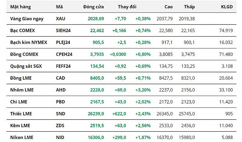 Nhóm kim loại quý tăng nhẹ khi một số nhà đầu tư tìm kiếm sự trú ẩn trước diễn biến phức tạp quanh khu vực Biển Đỏ. Giá bạc tăng 0,74% lên 22,46 USD/ounce. Giá bạch kim tăng nhẹ 0,28% lên 905,5 USD/ounce.