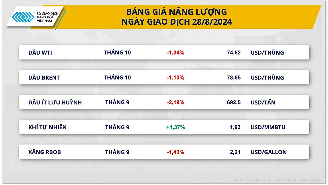 Trong đó, giá dầu thế giới nối dài đà suy yếu trong bối cảnh số liệu tồn kho của Mỹ giảm ít hơn so với kỳ vọng cùng với áp lực trong bài toán tăng trưởng nhu cầu. Kết phiên giá dầu thô Brent giảm 1,13%, xuống 78,65 USD/thùng. Giá dầu thô WTI giảm 1,01 USD, tương đương 1,34%, xuống mức 74,52 USD.