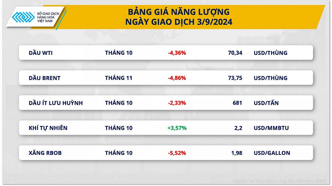 Thông tin từ Sở Giao dịch hàng hóa Việt Nam (MXV), thị trường năng lượng chìm trong sắc đỏ trong ngày giao dịch hôm qua. Ngoại trừ mặt hàng khí tự nhiên giá tăng 3,57% lên 2,2 USD/MMBtu, các mặt hàng còn lại đều lao dốc. Trong đó, đóng cửa, giá dầu WTI ở mức 70,34 USD/thùng, giảm 4,36%. Tương tự, giá dầu Brent ở mốc 73,75 USD/thùng, giảm gần 4,9%.