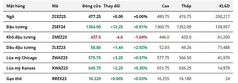 Giá lúa mì khởi sắc phiên thứ 4 liên tiếp. Thị trường đang kỳ vọng USDA sẽ tiếp tục hạ ước tính đối với tồn kho lúa mì thế giới niên vụ 23/24 trong báo cáo WASDE tới đây từ mức dự báo tháng trước, vốn được ghi nhận là mức thấp nhất kể từ niên vụ 15/16. Điều này phản ánh những lo ngại của thị trường về nguồn cung lúa mì, trong bối cảnh mùa vụ thiệt hại diễn ra ở các nước sản xuất chính và biến động chính trị còn tiềm ẩn nhiều rủi ro ảnh hưởng đến thị trường ngũ cốc toàn cầu.
