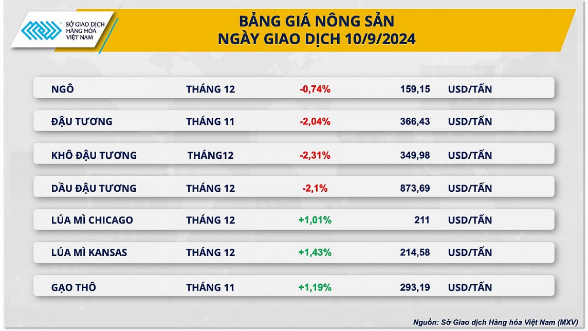 Thông tin từ Sở Giao dịch hàng hóa Việt Nam (MXV), mặt hàng đậu tương dẫn dắt xu hướng giảm của nhóm khi hạ hơn 2%, xuống mức thấp nhất trong vòng một tuần qua. Tình hình mùa vụ tại Mỹ tốt hơn dự kiến xoa dịu tâm lý lo ngại thời tiết khô hạn thời gian gần đây góp phần tác động lên diễn biến giá.