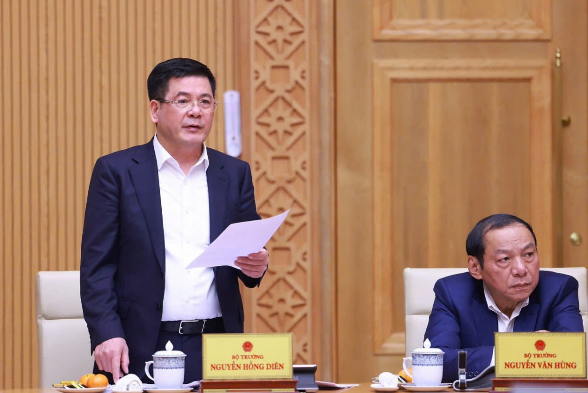 | Bộ trưởng Bộ Công Thương Nguyễn Hồng Diên báo cáo tại cuộc họp. Ảnh: VGP/Nhật Bắc |
