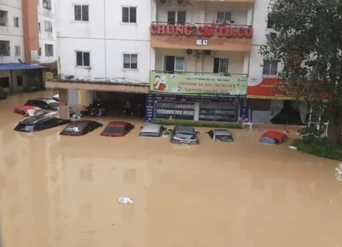 | Nhiều ôtô của người dân ở thành phố Thái Nguyên đậu trên vỉa hè cũng bị ngập. Ảnh: Người dân cung cấp |