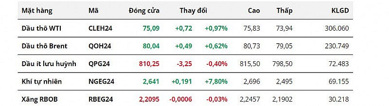 Chốt phiên, giá dầu WTI tăng 0,97% lên 75,09 USD/thùng. Dầu Brent tăng 0,62% lên 80,04 USD/thùng.