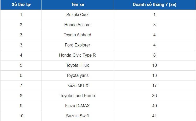 Ở cùng phân khúc giá với Ford Explorer, cái tên Honda lại 1 lần nữa réo tên với mẫu Honda Civic Type R. Doanh số cả tháng đạt 8 chiếc. Các vị trí còn lại lần lượt thuộc về các mẫu Toyota Hilux, Toyota Yaris, Isuzu MU-X, Toyota Land Prado, Isuzu D- MAX và cuối cùng là Suzuki Swift.