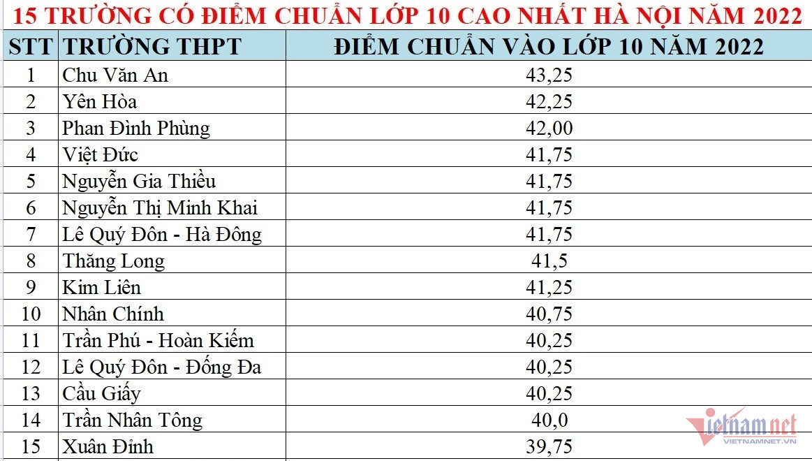 Trong nhiều năm gần đây, Trường THPT Chu Văn An luôn có điểm đầu vào lớp 10 cao nhất của Hà Nội. Dưới đây là 15 trường có điểm chuẩn vào lớp 10 cao nhất Hà Nội năm 2022: