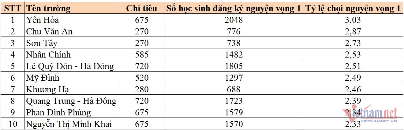 | Top 10 trường THPT công lập không chuyên tại Hà Nội có tỷ lệ chọi vào lớp 10 cao nhất năm 2022. |