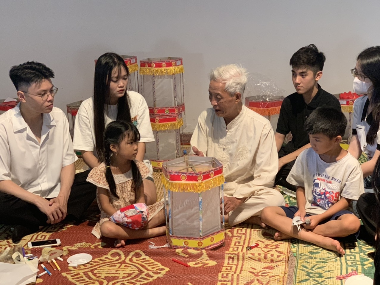| Nghệ nhân Nguyễn Văn Quyền hướng dẫn làm đèn kéo quân cho các em nhỏ |
