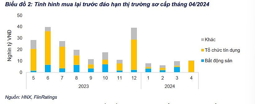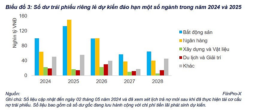 FiinRatings ghi nhận, tuy áp lực đáo hạn và hoàn thành nghĩa vụ nợ sau khi thực hiện giãn hoãn hoặc cơ cấu vẫn còn và các doanh nghiệp vẫn đang đáp ứng đúng tiến độ. Tính đến 02/05/2024, ước lượng giá trị trái phiếu doanh nghiệp đáo hạn còn lại trong năm đạt 257,17 nghìn tỷ VNĐ. Trong đó, giá trị trái phiếu của nhóm ngành bất động sản đạt 100,26 nghìn tỷ VNĐ, chiếm gần 39% tổng khối lượng đáo hạn và tương đương 2/3 số dư vào đầu tháng 12/2023.
