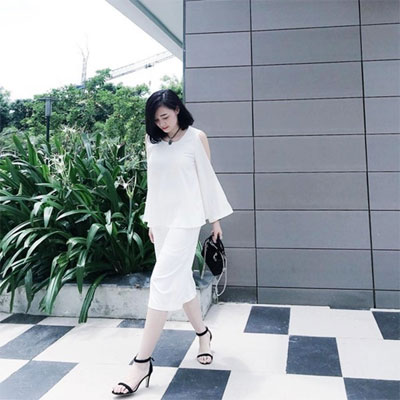 Ngọc Mon duyên dáng trong bộ cánh tuyền trắng, có chi tiết cắt xẻ phần vai tinh tế. Sandals cao gót và túi xách nhỏ màu sắc đồng điệu là cặp item giúp quý cô Hà Thành tô đậm phong cách thanh lịch, nhã nhặn