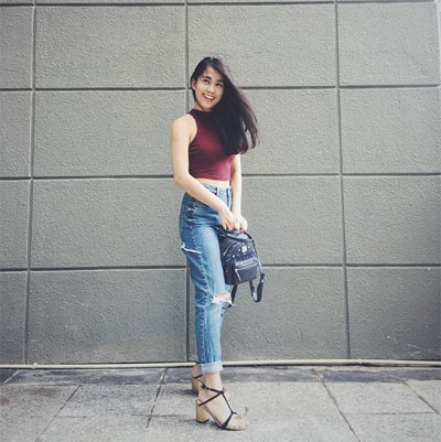 Quần jeans màu nhạt có thiết kế độc đáo, phối cùng áo hai dây đen giúp cô nàng Lâm Hương Giang khoe gu thời trang sành điệu. Cách kết hợp khéo léo mũ vành tròn, vòng cổ choker và giày cao gót tiệp màu đen cũng góp phần làm bật lên cá tính phóng khoáng