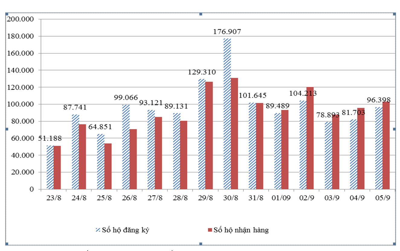 Cụ thể, theo ông Nguyễn Nguyên Phương – Phó Giám đốc Sở Công Thương TP. Hồ Chí Minh, tổng nhu cầu đặt hàng "đi chợ hộ" trên toàn địa bàn đạt 1.943.679 hộ, chiếm 77,24% tổng số hộ dân trên địa bàn Thành phố. Riêng trong ngày 5/9 có 96.398 hộ đăng ký đi chợ hộ, tăng 17,98% so với ngày hôm trước. Kết quả, có 103.155 hộ được cung ứng hàng hóa, tỷ lệ đạt 107,0% số hộ đăng ký (trong đó có 6.757 lượt đăng ký của những ngày trước được giải quyết).
