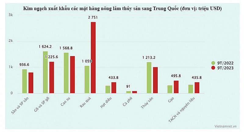 Trong 9 tháng qua, xuất khẩu một số mặt hàng nông sản sang thị trường tỷ dân này ghi nhận mức tăng đột biến. Cụ thể, xuất khẩu rau quả sang Trung Quốc giúp nước ta thu về 2,75 tỷ USD - mức cao kỷ lục lịch sử. So với cùng kỳ năm ngoái, kim ngạch xuất khẩu mặt hàng này tăng tới 161,8%.
