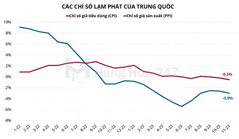 Cụ thể, chỉ số giá tiêu dùng (CPI) tháng 10 của Trung Quốc giảm 0,5% so với cùng kỳ năm ngoái, mức giảm mạnh nhất kể từ tháng 11/2020, theo Tổng cục Thống kê Trung Quốc (NBS) công bố ngày 9/12. Con số này thấp hơn dự đoán giảm 0,1% của thị trường và giảm mạnh hơn so với mức giảm 0,2% ghi nhận trong tháng 10. Theo NBS, một trong những nguyên nhân chính khiến CPI giảm trong tháng 11 là do giá thịt lợn giảm mạnh, giảm 31,8% sau khi giảm 30,1% trong tháng 10, do nguồn cung dư thừa trong khi nhu cầu suy yếu.