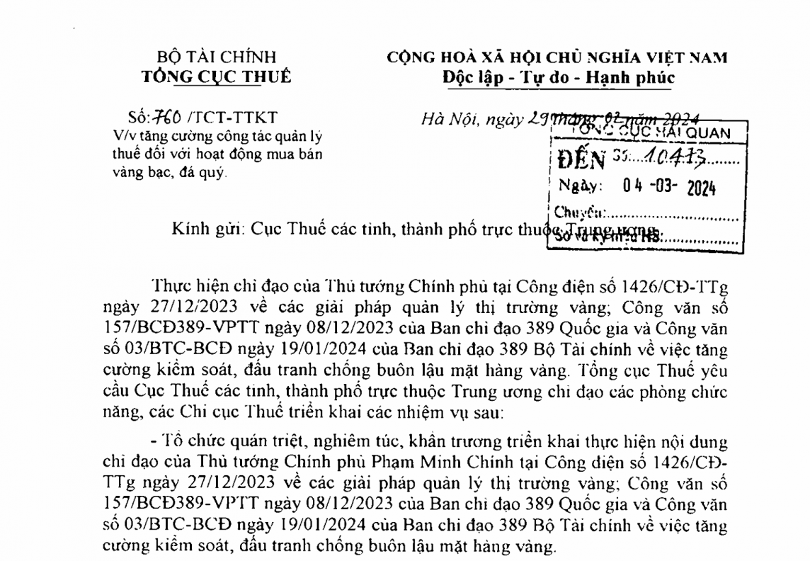 Cụ thể, Tổng cục Thuế yêu cầu cục Thuế các tỉnh, thành phố trực thuộc Trung ương chỉ đạo các phòng chức năng, Chi cục Thuế tổ chức quán triệt, nghiêm túc, khẩn trương triển khai thực hiện nội dung chỉ đạo của Thủ tướng Chính phủ tại Công điện số 1426/CĐ-TTg ngày 27/12/2023, Công văn số 157/BCĐ389-VPTT của Ban Chỉ đạo 389 Quốc gia và Công văn số 03/BTC-BCĐ của Ban Chỉ đạo 389 Bộ Tài chính.