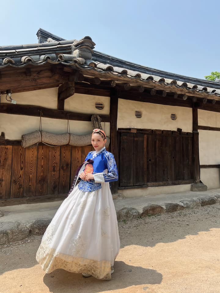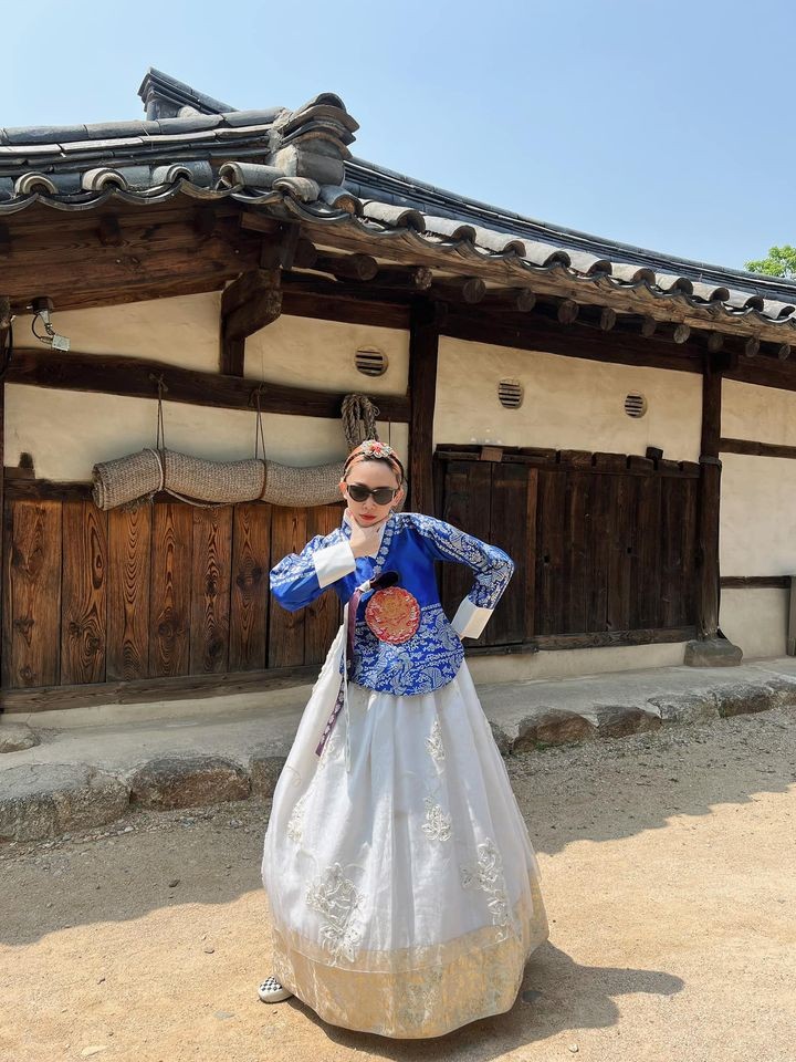 Trên trang cá nhân của mình, ca sĩ Tóc Tiên vừa chia sẻ một loạt ảnh độc đáo. Trong hình ảnh này, cô xuất hiện trước ống kính trong bộ trang phục Hanbok, chiếc áo truyền thống Hàn Quốc. Không chỉ vậy, cô còn thêm vào phong cách của mình một chiếc kính đen và những tạo dáng đầy phá cách.