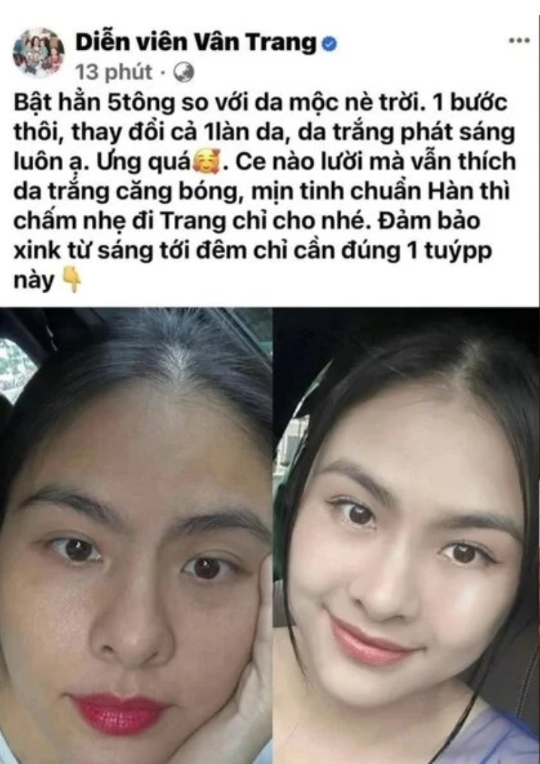 Trước đó, ngày 28/11, cô đăng tải bài viết với hình ảnh trước và sau khi sử dụng tuýp kem “Make Up” với nội dung ngắn gọn: “Bật hẳn 5 tông so với da mộc nè trời. 1 bước thôi, thay đổi cả một làn, da trắng phát sáng. Ưng quá. Chị em nào lười mà vẫn thích da trắng căng bóng, mịn tinh chuẩn Hàn thì chấm nhẹ đi Trang chỉ cho nhé. Đảm bảo xinh từ sáng tới đêm chỉ cần đúng 1 tuýp này”.