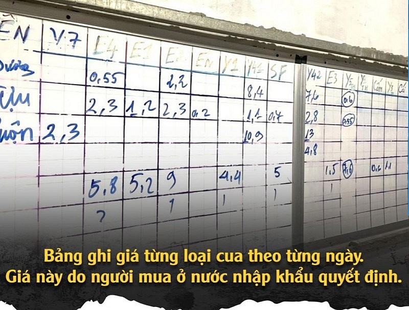 Theo ông V., khoảng 7h mỗi ngày, phía mua cua sẽ nhắn giá vào nhóm trò chuyện. Từng loại cua đều được ra giá cụ thể, có những thời điểm, giá cua thay đổi chóng mặt theo từng ngày.