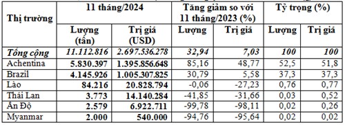 Trong đó, riêng tháng 11/2024 đạt gần 1,48 triệu tấn, tương đương 352,76 triệu USD, giá trung bình 238,4 USD/tấn, giảm 4,5% về lượng và giảm 2,2% kim ngạch so với tháng 10/2024 nhưng giá tăng 2,4%; so với tháng 11/2023 thì tăng mạnh 133,8% về lượng, tăng 113,3% về kim ngạch nhưng giảm 8,8% về giá.