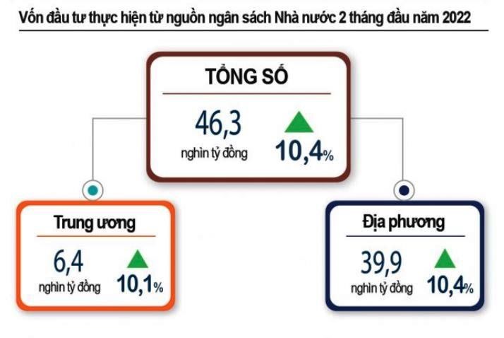 Tính chung 2 tháng đầu năm 2022, vốn đầu tư thực hiện từ nguồn Ngân sách Nhà nước ước đạt 46,3 nghìn tỉ đồng, bằng 8,8% kế hoạch năm và tăng 10,4% so với cùng kỳ năm trước (cùng kỳ năm 2021 bằng 8% và tăng 13,6%), gồm có: Vốn đầu tư thực hiện do Trung ương quản lý đạt 6,4 nghìn tỉ đồng, bằng 6,4% kế hoạch năm và tăng 10,1%; vốn đầu tư thực hiện do địa phương quản lý đạt 39,9 nghìn tỉ đồng, bằng 9,3% kế hoạch năm và tăng 10,4%.