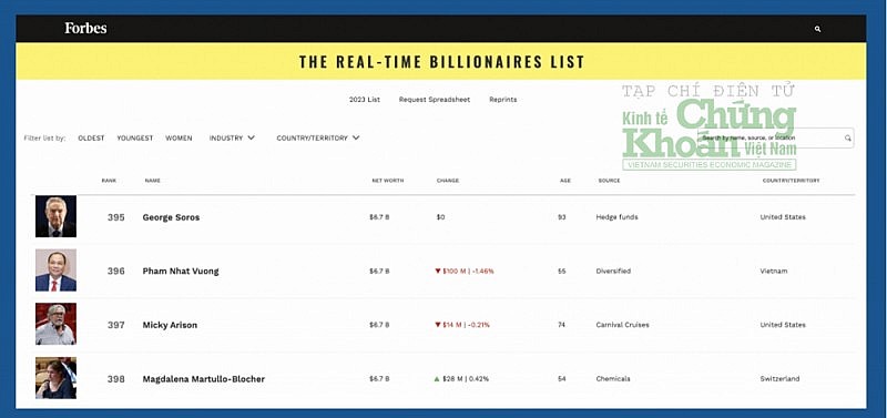 Đáng chú ý, trên bảng xếp hạng tỷ phú cập nhật theo thời gian thực của Forbes ngày 30/8 (giờ Mỹ), giá trị tài sản của nhà sáng lập VinFast là tỷ phú Phạm Nhật Vượng cũng được điều chỉnh giảm mạnh, xuống còn 6,7 tỷ USD. Theo đó, ông Vượng chỉ đứng thứ 396, tụt hàng trăm bậc trên bảng xếp hạng của Forbes.