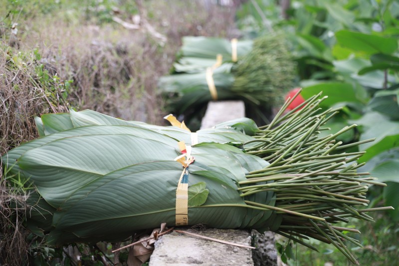 | Lá dong sau khi thu hoạch sẽ được sắp xếp thành từng bó, rửa nước sạch rồi vận chuyển đến cơ sở thu mua. |