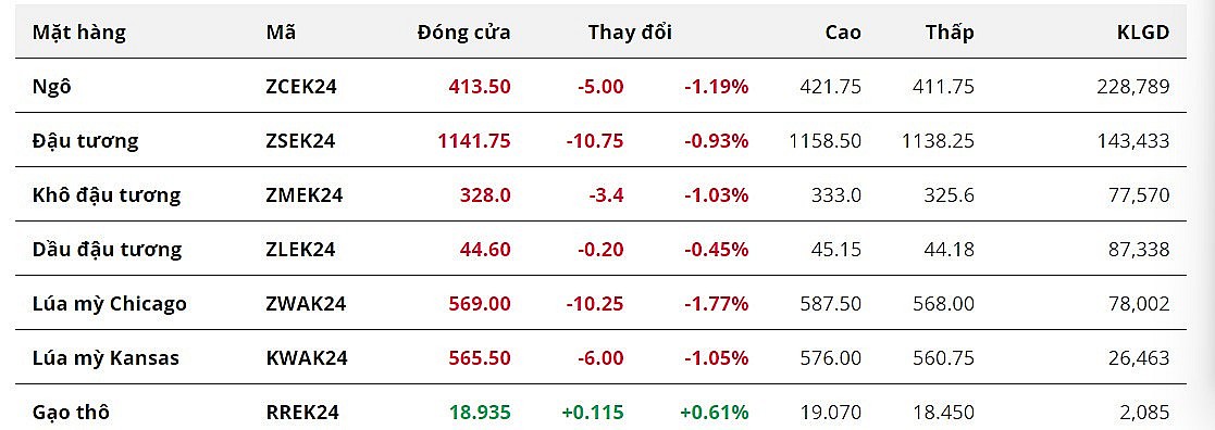 Đậu tương kết phiên với mức giảm gần 1%. Theo báo cáo Export Sales, Mỹ chỉ bán được 55.919 tấn đậu tương trong tuần 9 - 15/2, giảm mạnh 84,2% từ tuần trước đó, và ở dưới mức doanh số tối thiểu mà thị trường kỳ vọng. Con số trên đồng thời là khối lượng bán hàng tuần thấp nhất của Mỹ kể từ tháng 5/2023. Điều này đã phản ánh nhu cầu quốc tế đối với nguồn cung từ Mỹ đang ở mức thấp và các lô hàng giá rẻ từ Brazil vẫn tiếp tục tạo áp lực cạnh tranh tới đậu tương Mỹ.