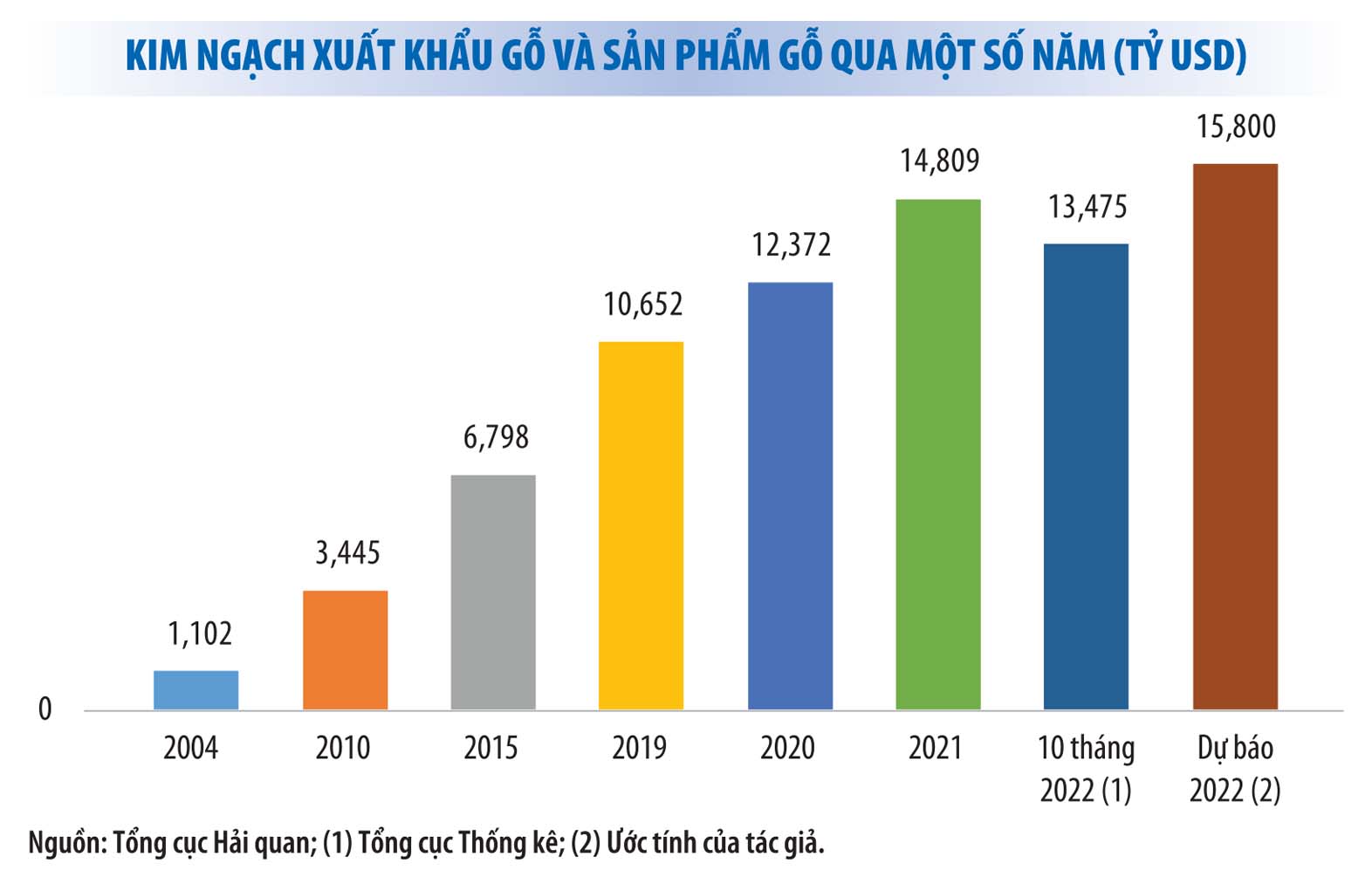 Gỗ và sản phẩm gỗ đã sớm tham gia “câu lạc bộ” các mặt hàng xuất khẩu có kim ngạch đạt từ 1 tỷ USD trở lên, hiện nằm trong nhóm cao. Trong 10 tháng đầu năm 2022, mặt hàng này đứng trong nhóm 6 mặt hàng đạt kim ngạch xuất khẩu trên 10 tỷ USD, lớn hơn mức cả năm từ năm 2020 trở về trước, ước cả năm cao gấp 14,3 lần năm 2004.