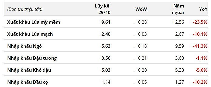 Tuy nhiên, đây là kết quả của sự cạnh tranh gay gắt đến từ lúa mì Nga, do đó việc xuất khẩu của EU giảm mạnh sẽ không phải yếu tố "bullish" giúp ngăn chặn đà giảm hiện tại của giá. Bên cạnh đó, nhập khẩu ngô của EU trong tuần kết thúc ngày 29/10 cũng giảm hơn một nửa so với mức 0,38 triệu tấn của một tuần trước, cho thấy nhu cầu của khối trong niên vụ hiện tại không quá cao nhờ vụ mùa bội thu. Đây sẽ tiếp tục là yếu tố "bearish" trong dài hạn đối với giá ngô.