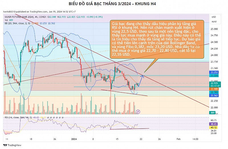Về mặt kỹ thuật, giá bạc đang cho thấy dấu hiệu phân kỳ tăng giá RSI ở khung H4. Nến rút chân mạnh xuất hiện ở vùng 22,5 USD, theo sau là một nến tăng đặc, cho thấy lực mua mạnh ở vùng giá này. Điều này có thể là tín hiệu cho thấy đà tăng sẽ tiếp tục. Dự báo giá có thể tiến lên cạnh trên của dải Bollinger Band, và vùng Fibo 0,382, mốc 23,20 USD. Nhà đầu tư có thể mua ở vùng giá 22,70 – 22,80 USD, cắt lỗ tại 22,55 USD.
